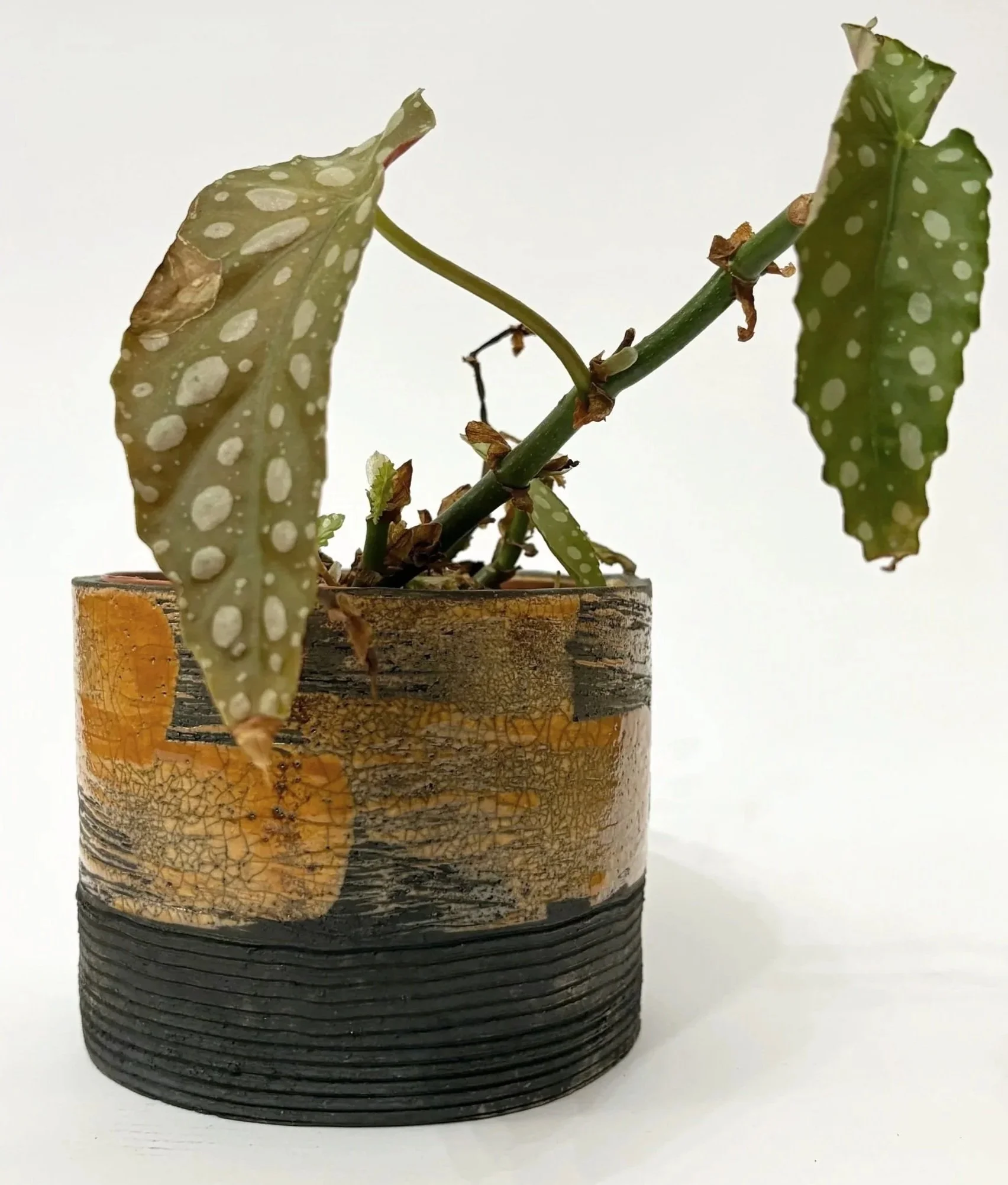 Porta vaso in ceramica Raku dalle forme compatte. La superficie alterna zone aranciate e nere, con segni e crepe tipiche della cottura, mentre la base presenta una lavorazione rigata.